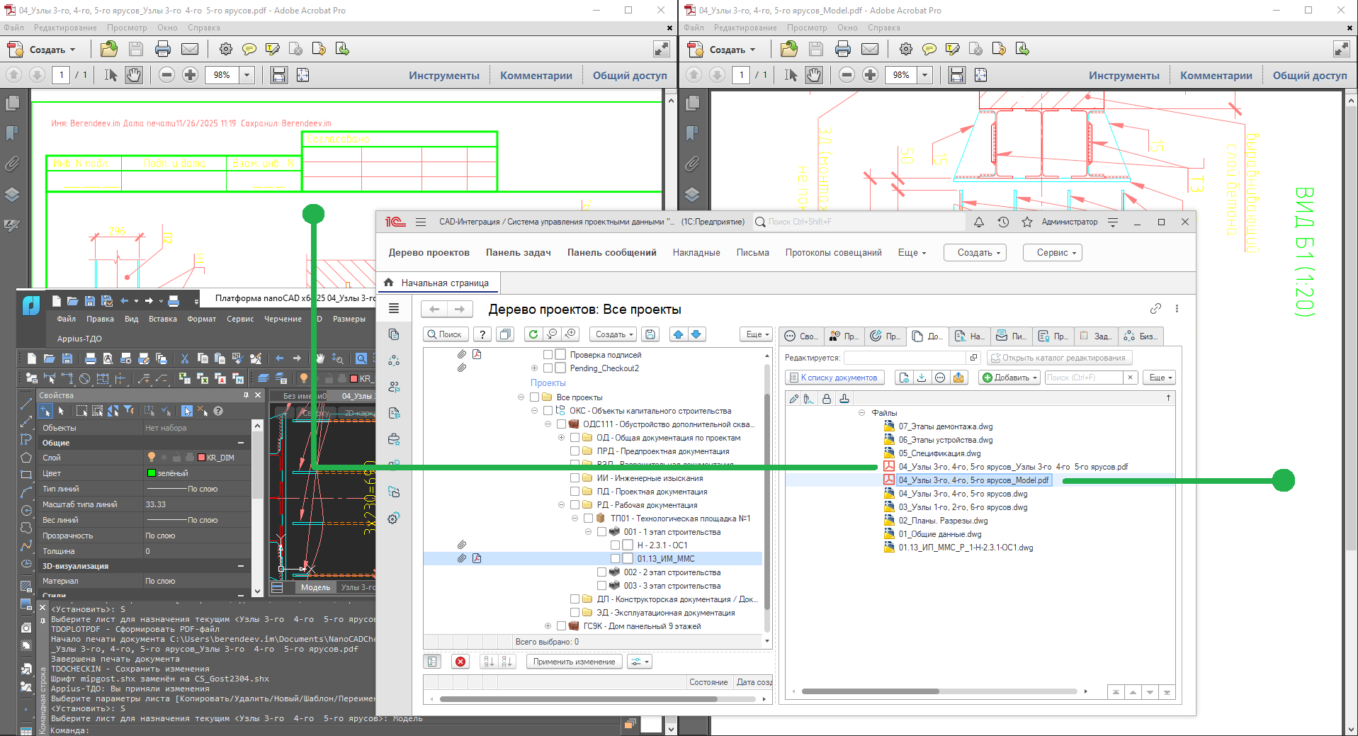 Для каждого сохраняемого чертежа может быть создана его PDF-версия, которая автоматически обновится при сохранении данных в Appius-ТДО. Настройка печати в PDF происходит стандартными средствами NanoCAD.