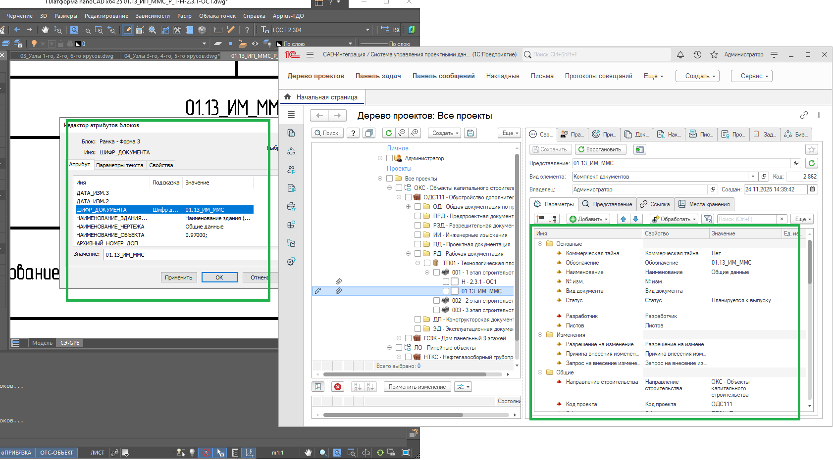 Атрибуты документа синхронизируются с атрибутами файла DWG в NanoCAD при начале редактирования.