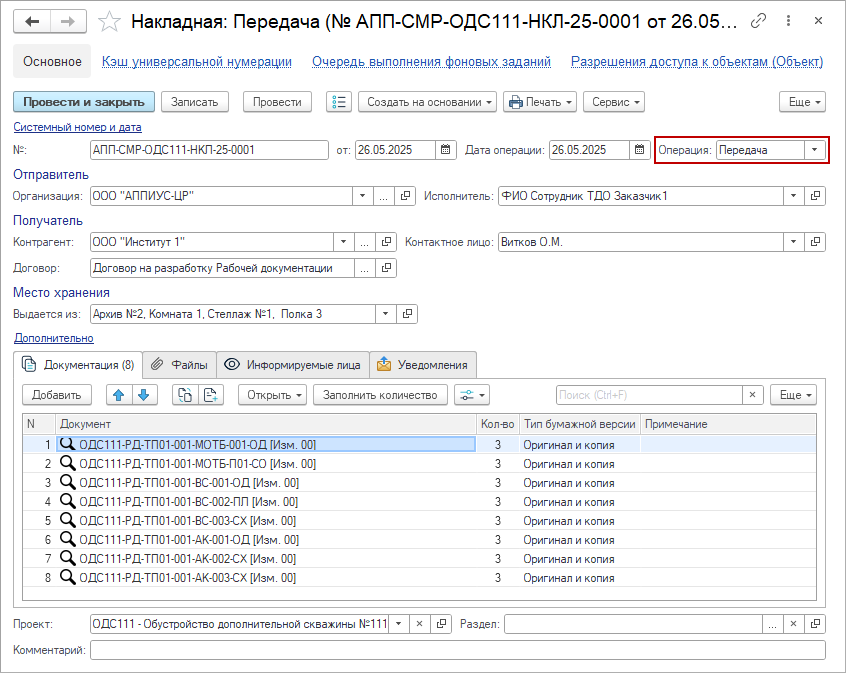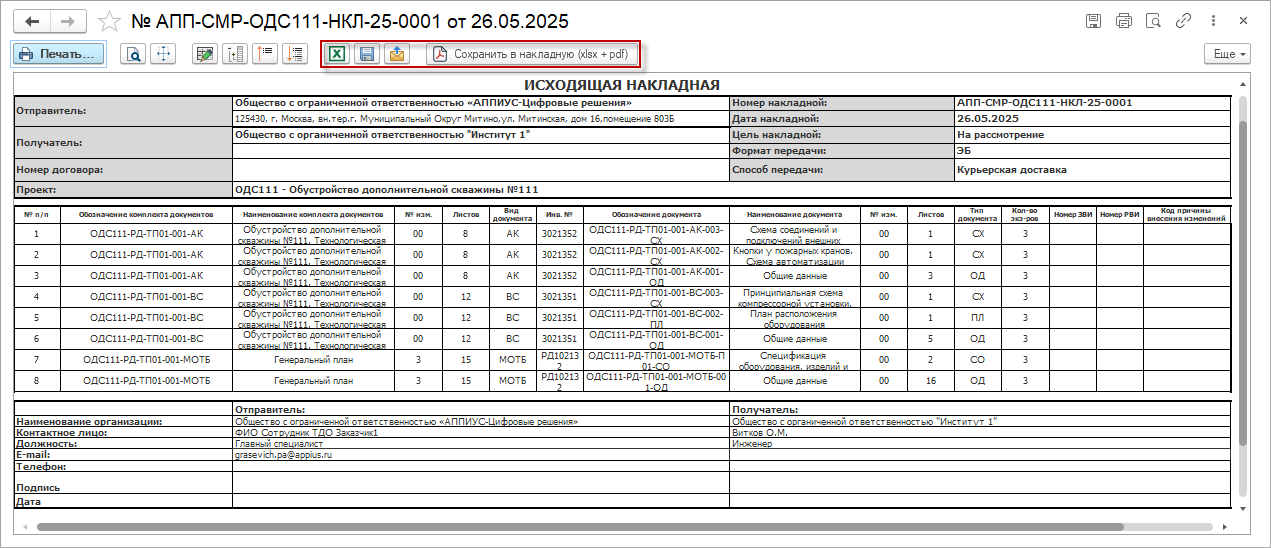 Система автоматически формирует печатную форму накладной на передачу в соответствии с процедурой управления технической документацией.